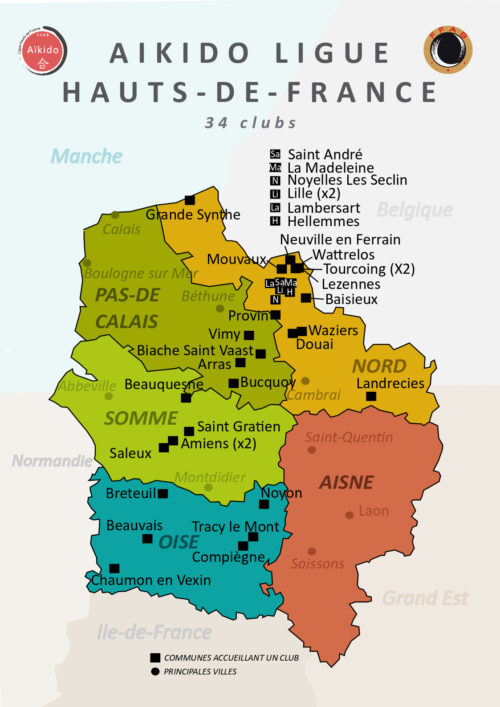 La Ligue Aïkido Hauts-de-France (instance régionale), composée de 5 départements, accueille près de 1 000 pratiquants d’aïkido dans 34 clubs affiliés à la Fédération Française d’Aikido et de Budo (FFAB).Ainsi on peut compter :